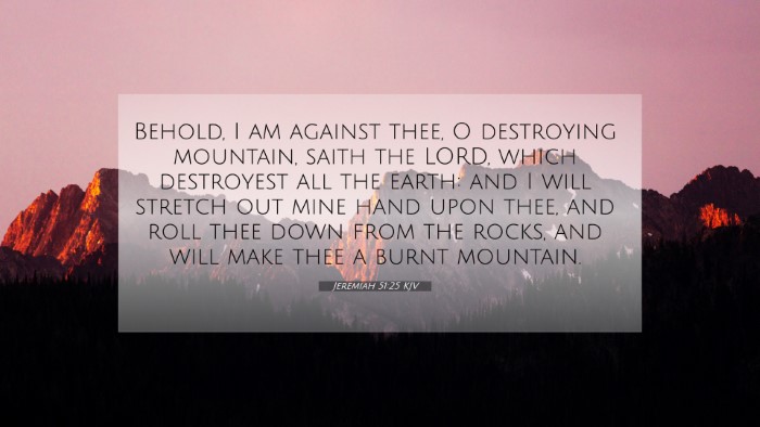 This verse is a striking declaration from God against Babylon, symbolically represented as a "destroying mountain." This representation emphasizes both its great power and impending downfall. Below is an analysis and interpretation of this verse, relying on insights from various public domain commentaries.