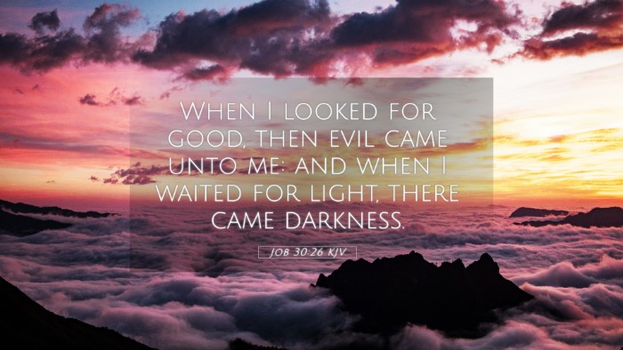 Job 30:26 states: "But when I hoped for good, evil came; and when I waited for light, there came darkness." This verse captures the deep despair and feeling of betrayal that Job experienced as he navigated his suffering. To delve deeper into its meaning, we can explore various insights from public domain commentaries.