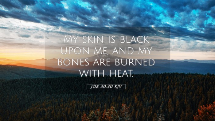 Job 30:30 serves as a poignant reminder of the depths of human suffering, providing insight into both the historical context of Job's life and the broader themes of pain and desolation present in the Bible. Through the exploration of cross-references and thematic connections, readers can deepen their understanding of Scripture and find solace in the narratives shared by many witnesses to suffering.