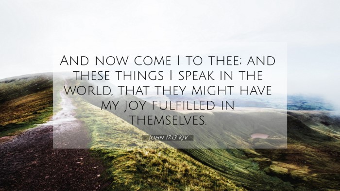 John 17:13 is a powerful reminder of Jesus' desire for His followers to find joy and assurance in their relationship with Him. By exploring this verse through the lens of public domain commentaries, one can appreciate the depth of meaning packed into this succinct prayer. Understanding related scriptures further enhances the richness of this message, enabling believers to navigate their faith with joy derived from their relationship with Christ.