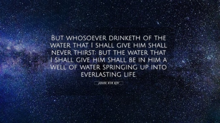 John 4:14 encapsulates the heart of Christian faith: the promise of eternal fulfillment through Jesus Christ. The living water represents the transformative power of faith and the indwelling presence of the Holy Spirit in believers. Embracing the connections between various biblical texts enriches our understanding of God's overarching narrative of redemption.