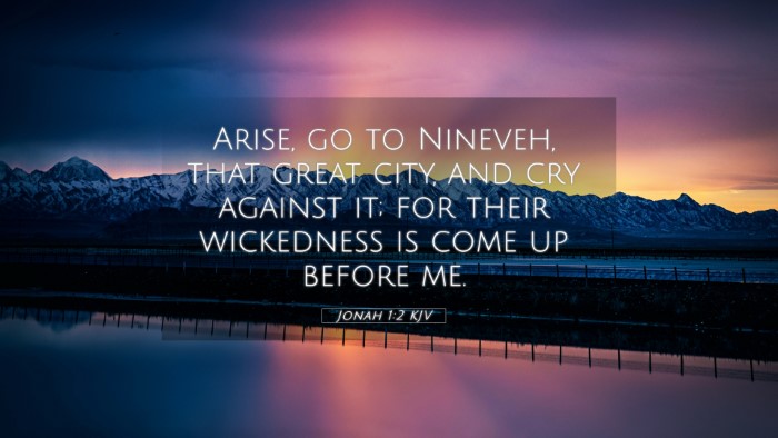 In this verse, we find God commanding Jonah to go to Nineveh, a significant and populous city known for its wickedness. The divine call to action illustrates God's awareness of the moral state of cities and nations, prompting a message of repentance.