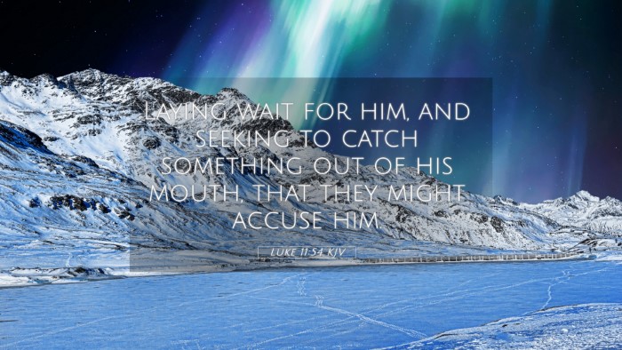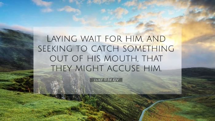 Luke 11:54 states, "Laying wait for him, and seeking to catch something out of his mouth, that they might accuse him." This verse captures the essence of opposition faced by Jesus from the religious leaders of His time. Here, we explore the depth of its meaning through insights from esteemed public domain commentaries.