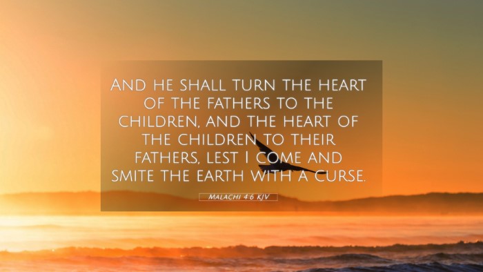 This closing verse of the Old Testament encapsulates a vital theme of reconciliation and restoration. The prophecy speaks of a future forerunner, traditionally understood as John the Baptist, who prepares the way for the coming of the Lord. The verse provides a poignant reminder of the familial relationships and the necessity for unity and understanding across generations.
