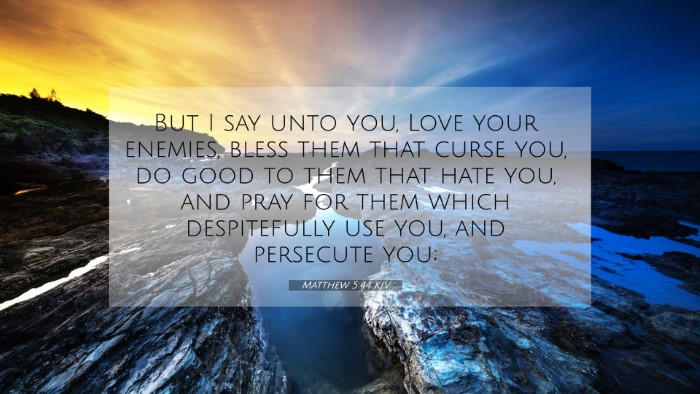 - Albert Barnes: Barnes interprets this verse as an indication of the Christian's duty to exhibit love regardless of personal feelings. The act of praying for one’s persecutors is highlighted as a tangible expression of love, pointing to the notion of God’s grace extending beyond societal boundaries.