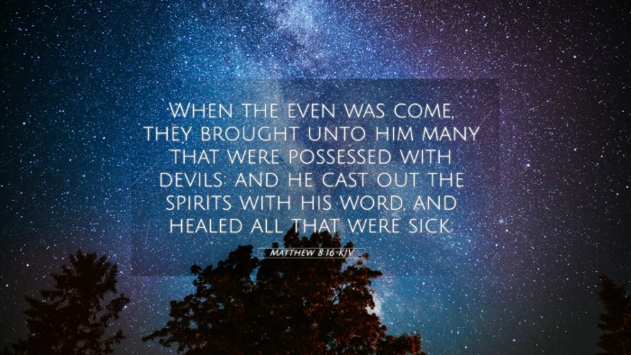 Matthew 8:16 serves as a microcosm of the broader biblical narrative concerning Jesus' power, compassion, and authority. By exploring cross-references and thematic connections, readers can gain richer insights into the life and mission of Christ, revealing how this verse connects to others and contributes to the overarching story of redemption in the Scriptures.