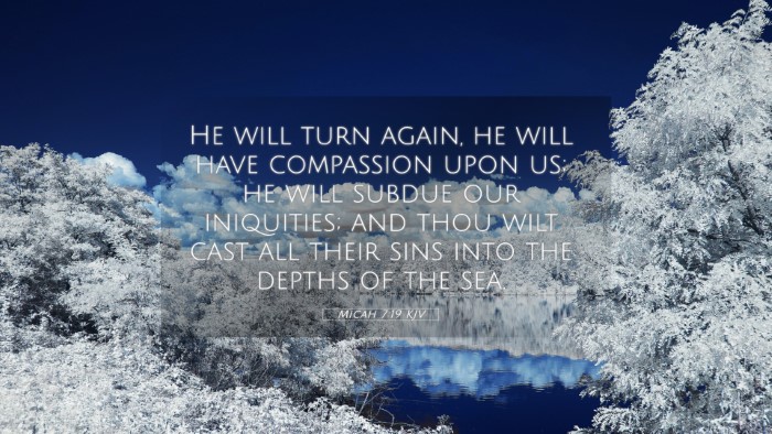 Barnes interprets the verse as a declaration of the restoration of Israel. He contends that Micah speaks of a future where the nation will be revitalized through forgiveness. The mention of God subduing iniquities indicates His strength in overcoming sin, while the promise of compassion assures believers of His continual care and relenting nature towards those who seek Him.