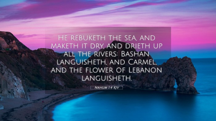This verse reflects the sovereign power of God over nature and creation. In the context of Nahum, it is a declaration of God’s judgment against Nineveh, highlighting that even the most formidable natural elements are subject to His command. The imagery of drying up seas and rivers emphasizes His authority over life-sustaining water sources, which are vital for agriculture and civilization.