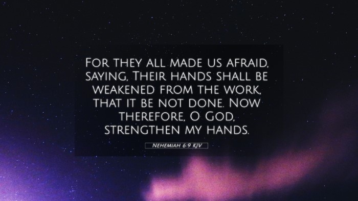 Nehemiah 6:9 serves as a powerful reminder of the challenges leaders face and the essential role of divine strength in overcoming fear and adversity. Through cross-referencing and thematic explorations, believers can deepen their understanding of this verse and its implications for their faith journeys. The interconnectedness of scripture provides a comprehensive framework for understanding the truths presented in Nehemiah and encourages a resilient reliance on God amidst external pressures.