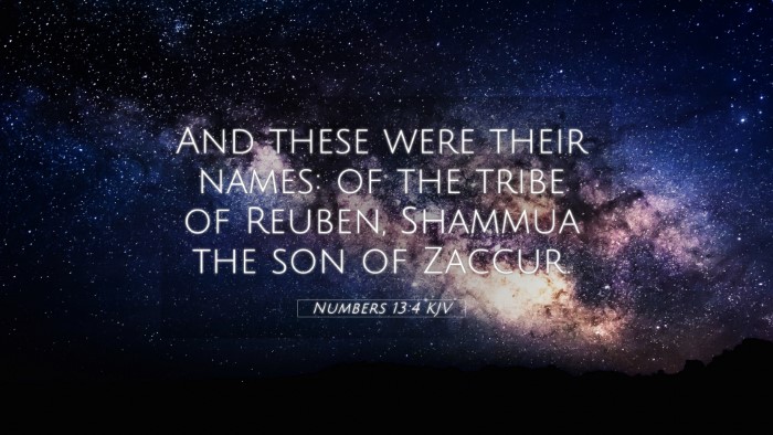 Numbers 13:4 states, "And these were their names: of the tribe of Reuben, Shammua the son of Zaccur." This verse serves as an introductory remark to the selection of spies sent to scout the land of Canaan, which plays a crucial role in the Israelites' journey to the Promised Land.