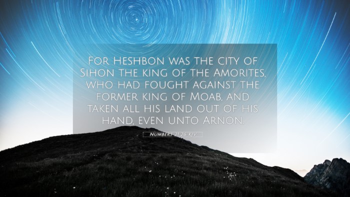 The verse Numbers 21:26 states: “For Heshbon was the city of Sihon, king of the Amorites, which fought against the former king of Moab, and took all his land out of his hand, even unto Arnon.” This verse hooks into a broader narrative of conquest and inheritance among the Israelites, and its commentary offers rich insight into its meaning and implications.
