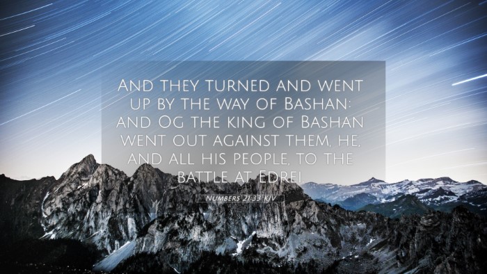 In Numbers 21:33, we encounter a significant moment in the journey of the Israelites as they navigate through the wilderness. The verse illustrates the confrontation between the Israelites and Og, the formidable king of Bashan, as they prepare for battle. This passage not only depicts a historical event but serves to convey deeper theological implications about God's sovereignty and protection over His people.