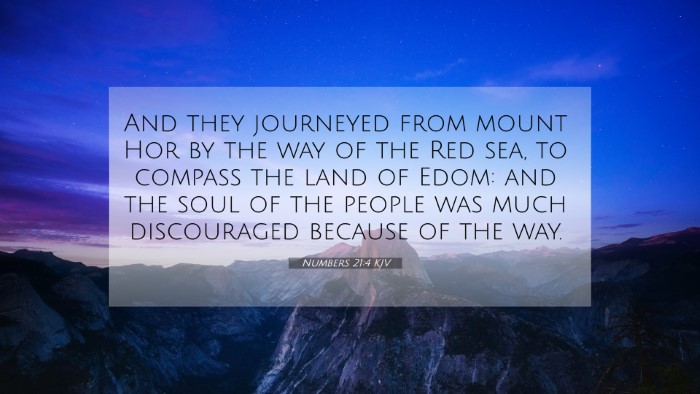 Albert Barnes emphasizes the significance of the journey through Edom and the emotional state of the Israelites, indicating that the prolonged wanderings and hardships served to test their faith and reliance on God. Their discouragement can reflect a broader theme of spiritual trials among God's people.