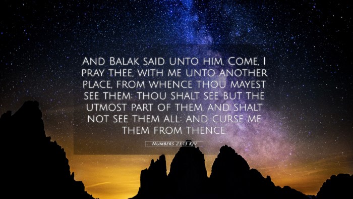 The verse Numbers 23:13 states, "And Balak said unto him, Come, I pray thee, with me unto another place, from whence thou mayest see them: thou shalt see but the utmost part of them, and shalt not see them all: and curse me them from thence." This verse captures a moment in the narrative where Balak, the king of Moab, seeks the prophet Balaam to curse the Israelites, seeing their large number as a threat.