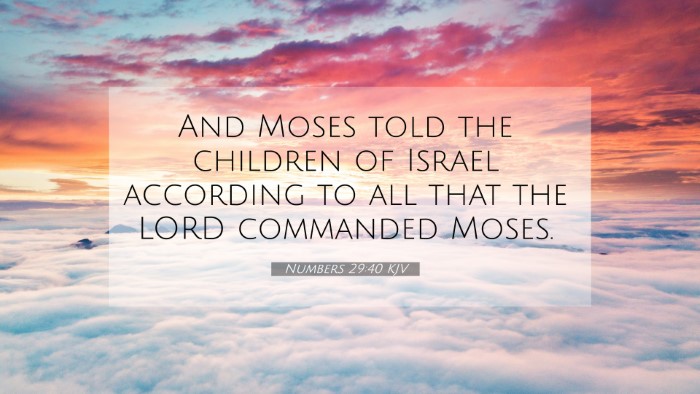 Numbers 29:40 states: “And Moses told the children of Israel according to all that the Lord commanded Moses.” This verse underscores the importance of obedience and communication of God's commands to His people through the leadership of Moses.