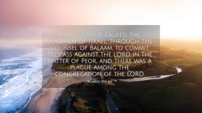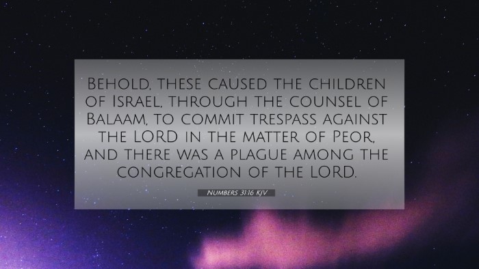 Numbers 31:16 states: “Behold, these caused the children of Israel, through the counsel of Balaam, to commit trespass against the LORD in the matter of Peor, and there was a plague among the congregation of the LORD.” This passage highlights significant themes within the broader biblical narrative, specifically regarding temptation, idolatry, and spiritual integrity.
