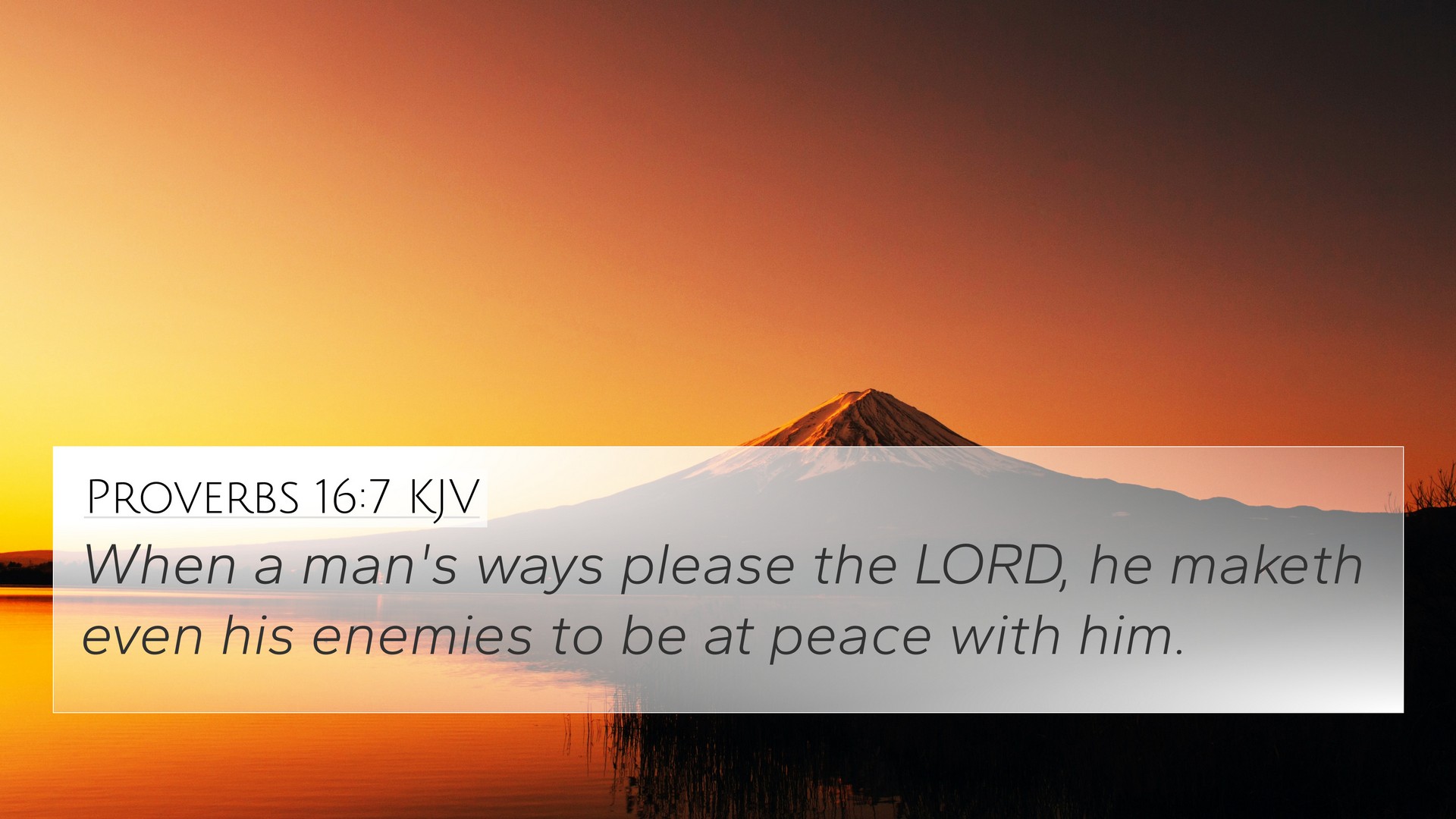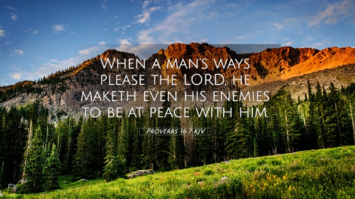 Proverbs 16:7 states: “When a man's ways please the Lord, he makes even his enemies to be at peace with him.” This verse emphasizes the theme of divine favor and the profound impact it has on a believer's life. In analyzing this scripture, we can derive insights from several public domain commentaries.