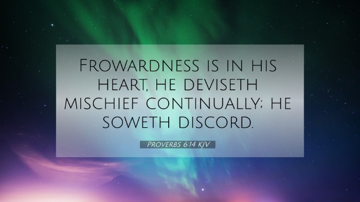 Proverbs 6:14 warns against the character traits of deceitfulness and harmful intentions present in certain individuals. This verse highlights the inner motivations that lead to malicious behavior. Below, we explore the meanings derived from various public domain commentaries, revealing the biblical perspective on such actions.