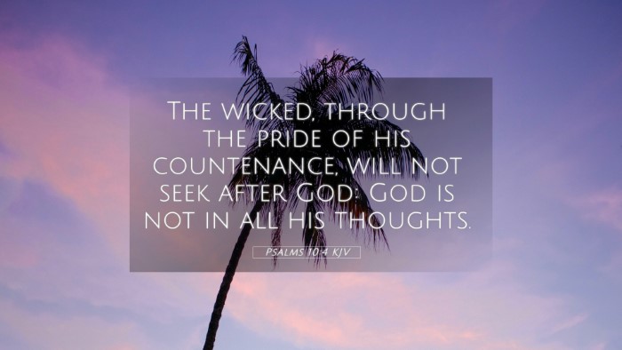 The verse suggests that the wicked, characterized by pride, do not seek God or think of Him in their lives. This can be interpreted as a commentary on how pride leads to a disconnection from the divine. Both Albert Barnes and Matthew Henry emphasize this theme, noting how an arrogant heart shuts out the consideration of God.