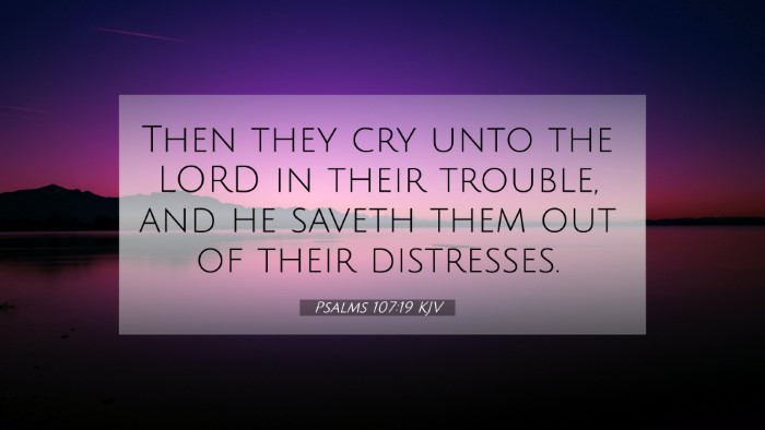 This section features a detailed cross-reference designed to enrich your understanding of the Scriptures. Below, you will find carefully selected verses that echo the themes and teachings related to Psalms 107:19 KJV. Click on any image to explore detailed analyses of related Bible verses and uncover deeper theological insights.