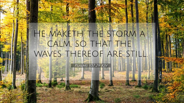 Psalms 107:29 magnificently encapsulates God's power to restore peace amidst turmoil. By engaging with public domain commentaries and related scriptures, one can deeply appreciate its significance and how it resonates with other biblical teachings. Utilizing cross-references not only enriches one’s understanding of this verse but also highlights the overarching narrative of hope and divine steadfastness found throughout Scripture.