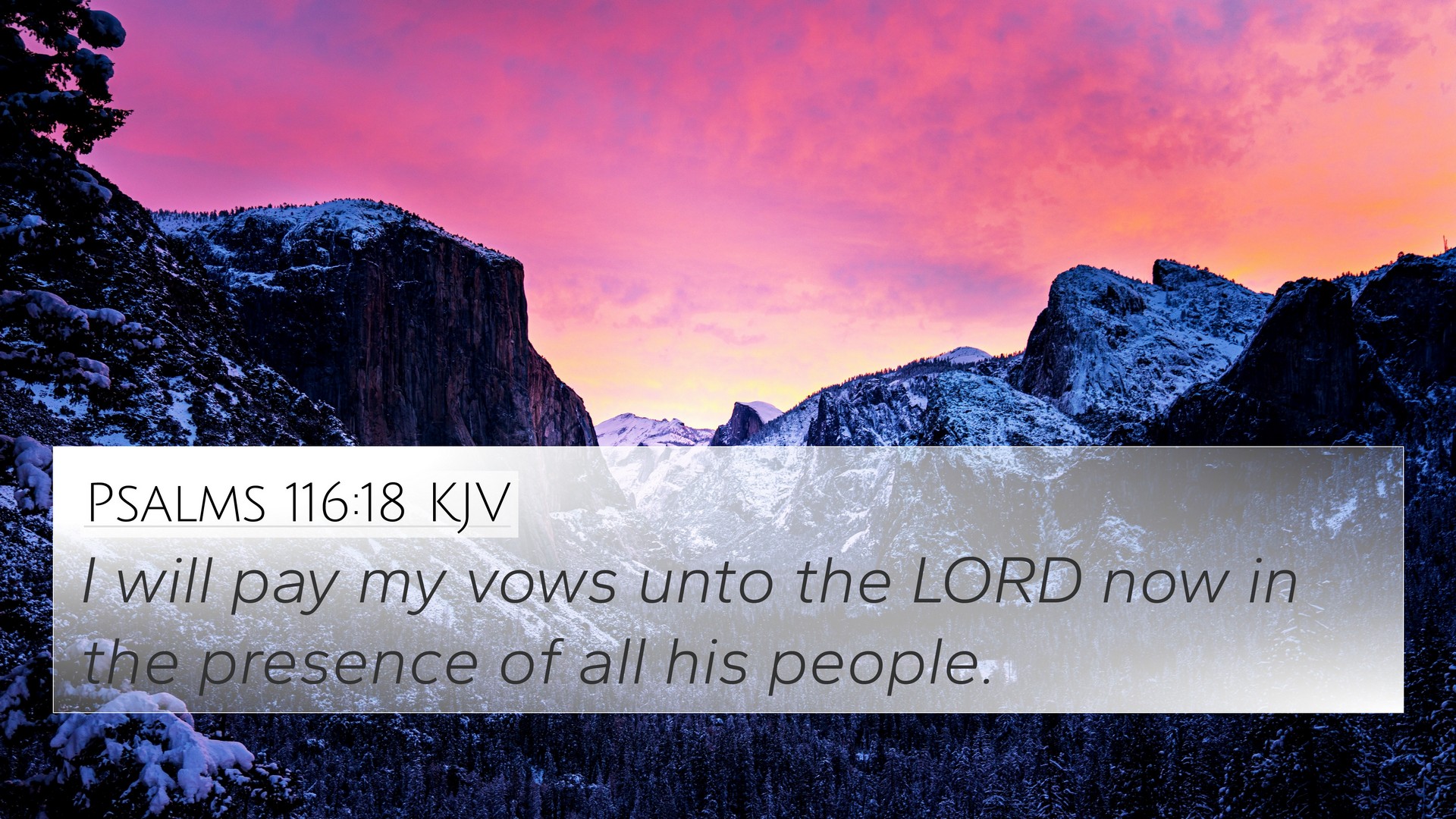 Psalms 116:18 states: "I will pay my vows unto the Lord now in the presence of all his people." This verse encapsulates a public declaration of gratitude and commitment to God. Below is a comprehensive interpretation combining insights from several public domain commentaries.