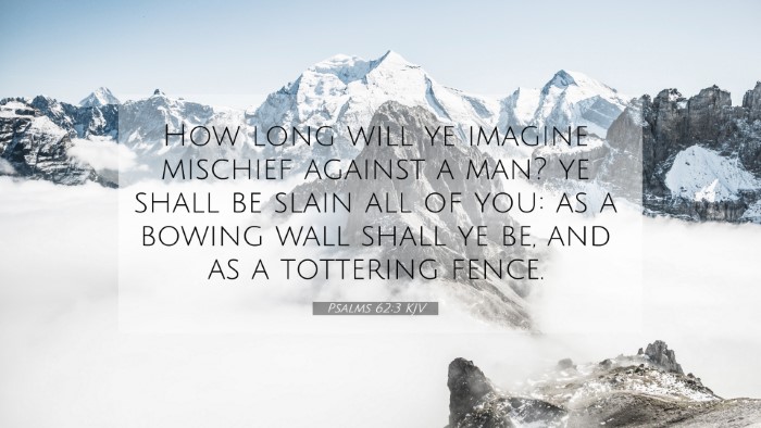 Psalms 62:3 states, “How long will you assay a man? Ye shall be slain, all of you: as a bowing wall shall ye be, and as a tottering fence.” This verse is a poignant reflection of the psalmist's feelings of vulnerability and the attempts of others to undermine him. Let us delve into an intricate summary of this verse with insights drawn from several public domain commentaries.