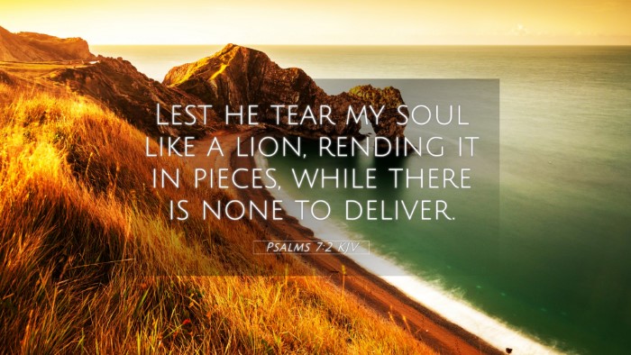 Psalms 7:2 serves as a potent reminder of the vulnerabilities faced by believers amidst trials and the assurance of God's capacity to deliver those who trust in Him. The combined insights from various commentaries highlight the necessity of reliance on God while providing a rich framework for understanding the biblical context. For further study, consider utilizing Bible cross-reference guides to explore these connections more deeply and gain insights into related scriptures.