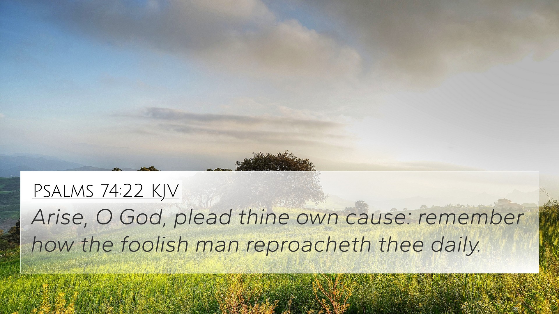In this verse, the psalmist invokes God to take action on behalf of His own cause. This cry reflects a deep desire for divine intervention and justice in the face of mockery and reproach from the foolish. The verse emphasizes God's role as a defender of His name and truth amidst adversities faced by His people. Let us explore various commentaries to uncover a richer understanding of this poignant plea.