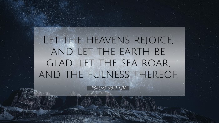 Psalms 96:11 reads: "Let the heavens rejoice, and let the earth be glad; let the sea roar, and the fullness thereof." This verse conveys a powerful message of joy and celebration within the entirety of creation as it acknowledges the majesty and glory of the Lord. It illustrates that all parts of the universe are called to participate in the worship of God.