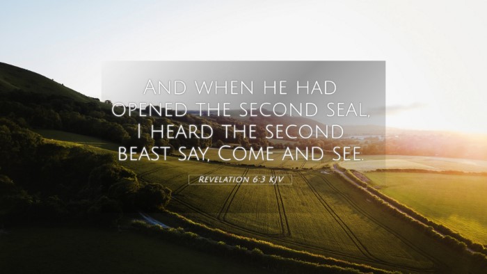 Revelation 6:3: "And when he had opened the second seal, I heard the second beast say, Come and see." This verse ushers in the second seal of the prophetic vision given to John, revealing profound insights into the unfolding narrative of the end times and the judgments of God.