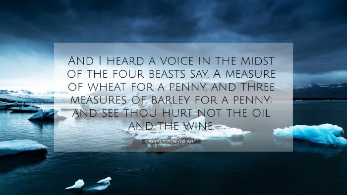 Albert Barnes takes a slightly different approach, focusing on the symbolism of the 'four beasts' and the voice that speaks. He interprets the voice as a divine declaration of the economic conditions during the tribulation period. Barnes notes that the specific measures and costs presented symbolize the idea of survival amidst harsh conditions. He also sees the 'oil and wine' as representing blessings that God preserves even in times of complete desolation for a select few, further emphasizing the theme of divine sovereignty over creation.