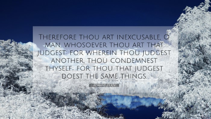 According to Matthew Henry, Paul introduces a solemn warning against the tendency to judge others while being guilty of similar faults. He points out that such hypocrisy manifests a lack of self-awareness and understanding of God's law. The spirit of judgment can lead to self-condemnation, as one is often blind to their own shortcomings. The essence here is that to judge another is, in a way, to hold oneself accountable to the same standards.