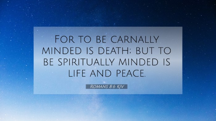 Matthew Henry Commentary: Matthew Henry notes that "to be carnally minded" refers to a life governed by sinful tendencies and worldly pursuits, leading to spiritual death. In contrast, "to be spiritually minded" is to embrace life through faith which leads to peace and a harmonious relationship with God. This commentary underscores the ultimate consequences of our mindset—whether temporal or eternal.