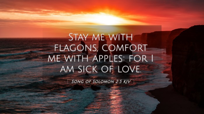 Matthew Henry emphasizes the intensity of love conveyed in this verse. He suggests that the requests made in the verse represent not only physical needs but also emotional ones. The use of "comfort" indicates that love brings both joy and a longing that causes distress. Henry highlights the importance of mutual care in romantic relationships.