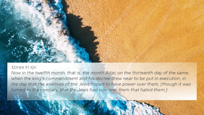 Now in the twelfth month, that is, the month Adar, on the thirteenth day of the same, when the king's commandment and his decree drew near to be put in execution, in the day that the enemies of the Jews hoped to have power over them, (though it was turned to the contrary, that the Jews had rule over them that hated them;)